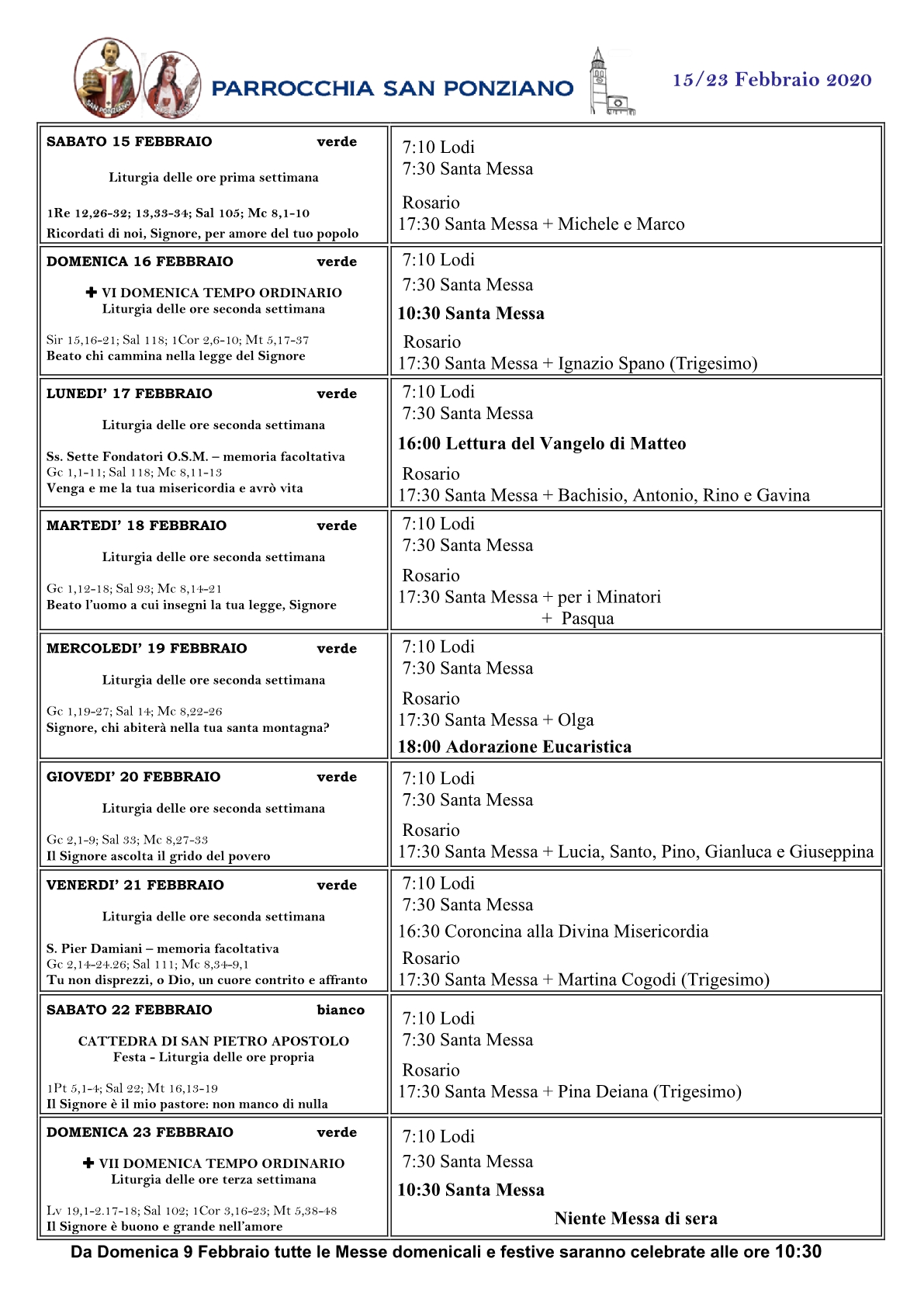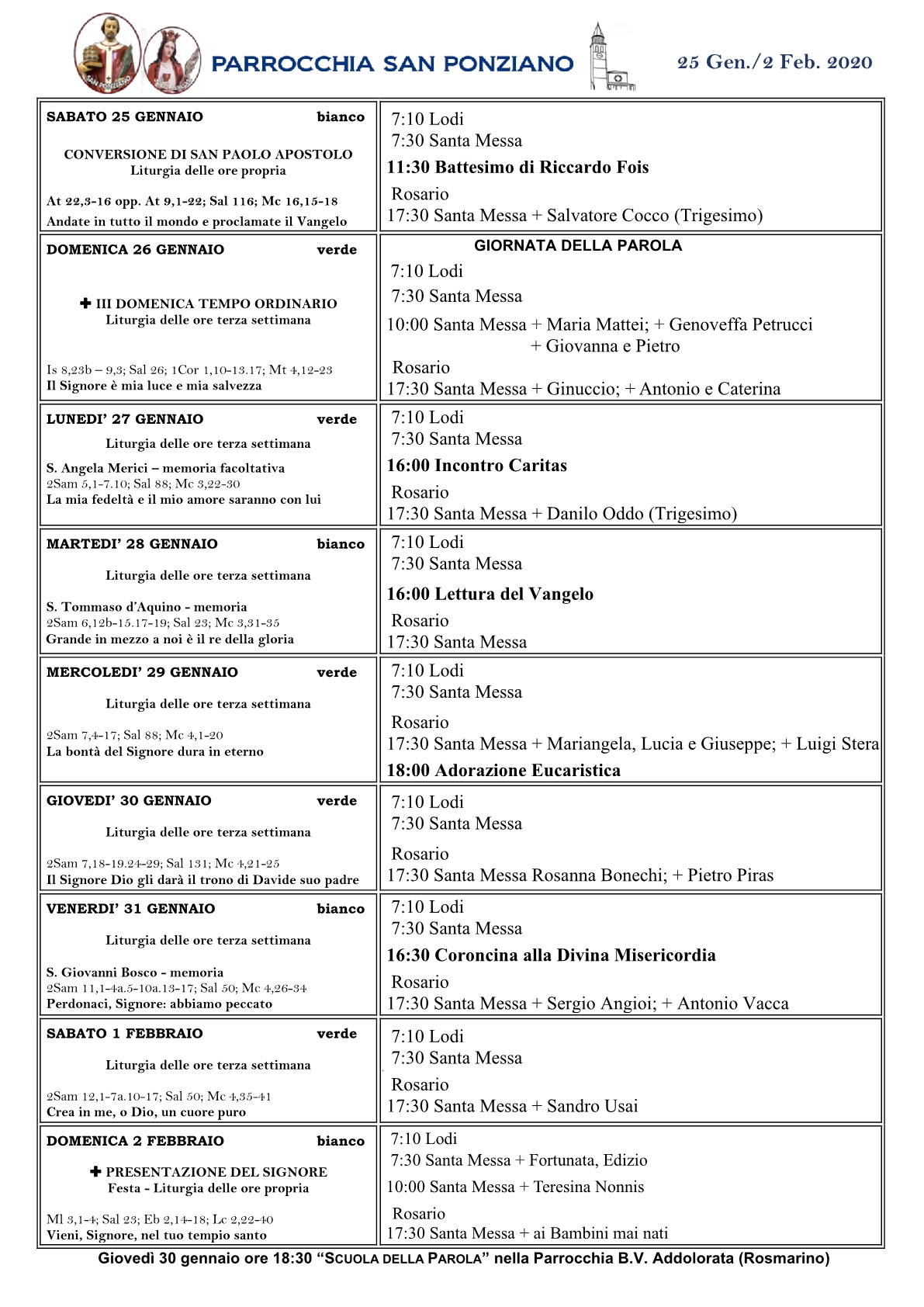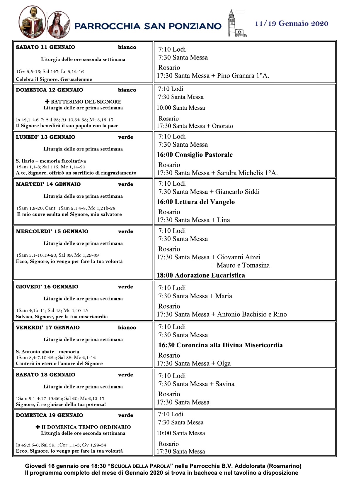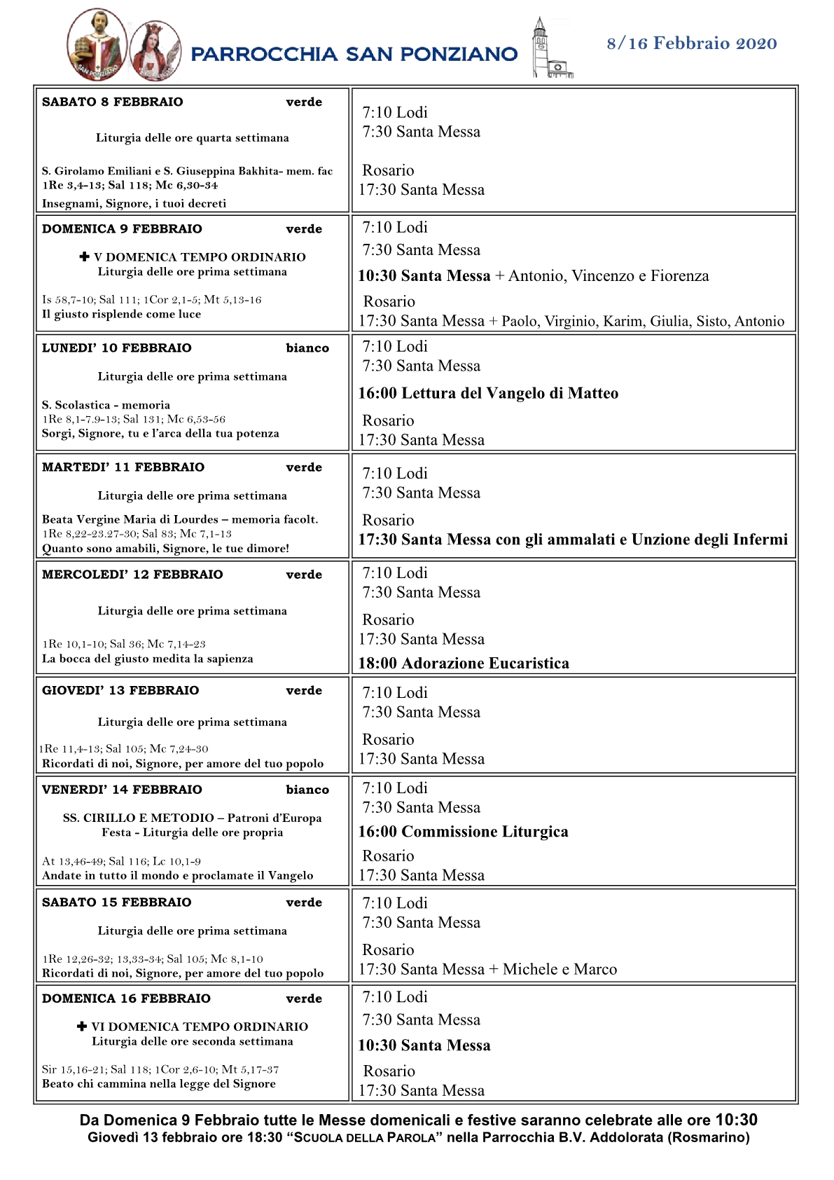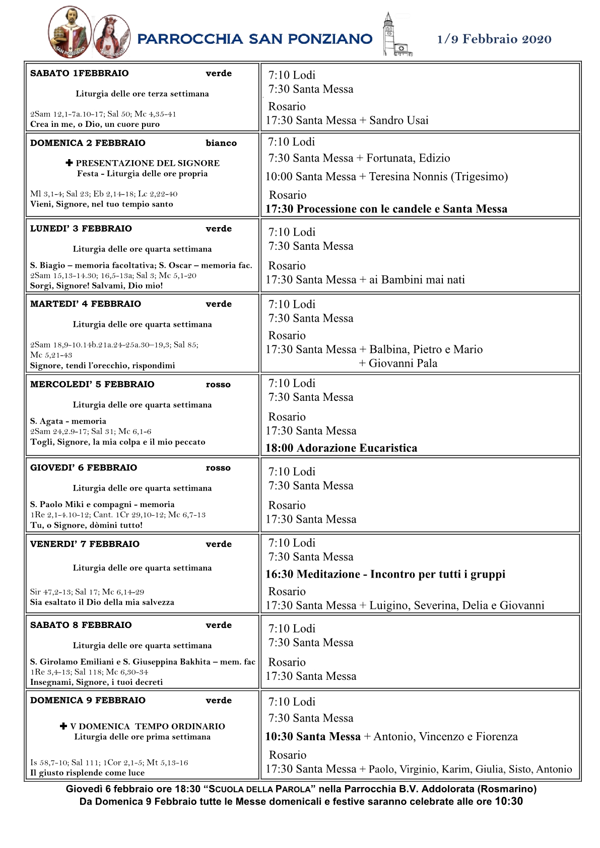 Avvisi della settimana (vedi programma incontri del mese Febbraio 2020 in bacheca)