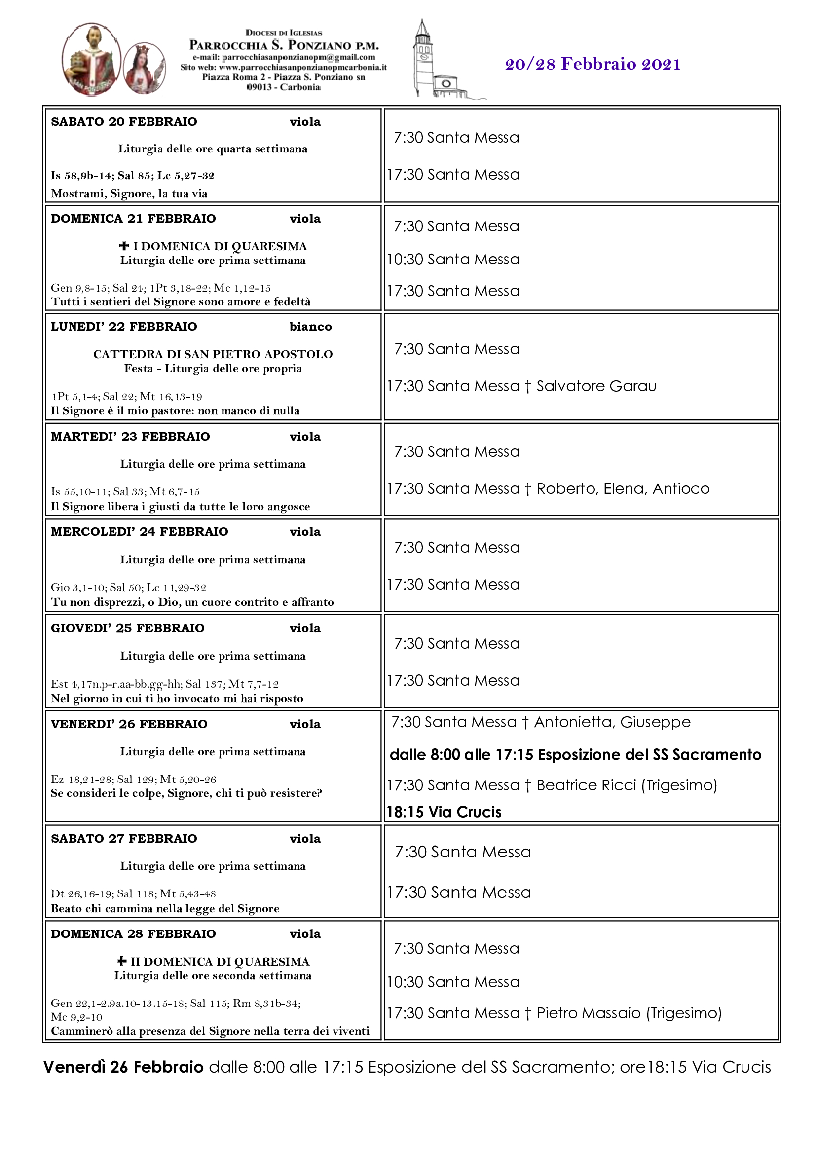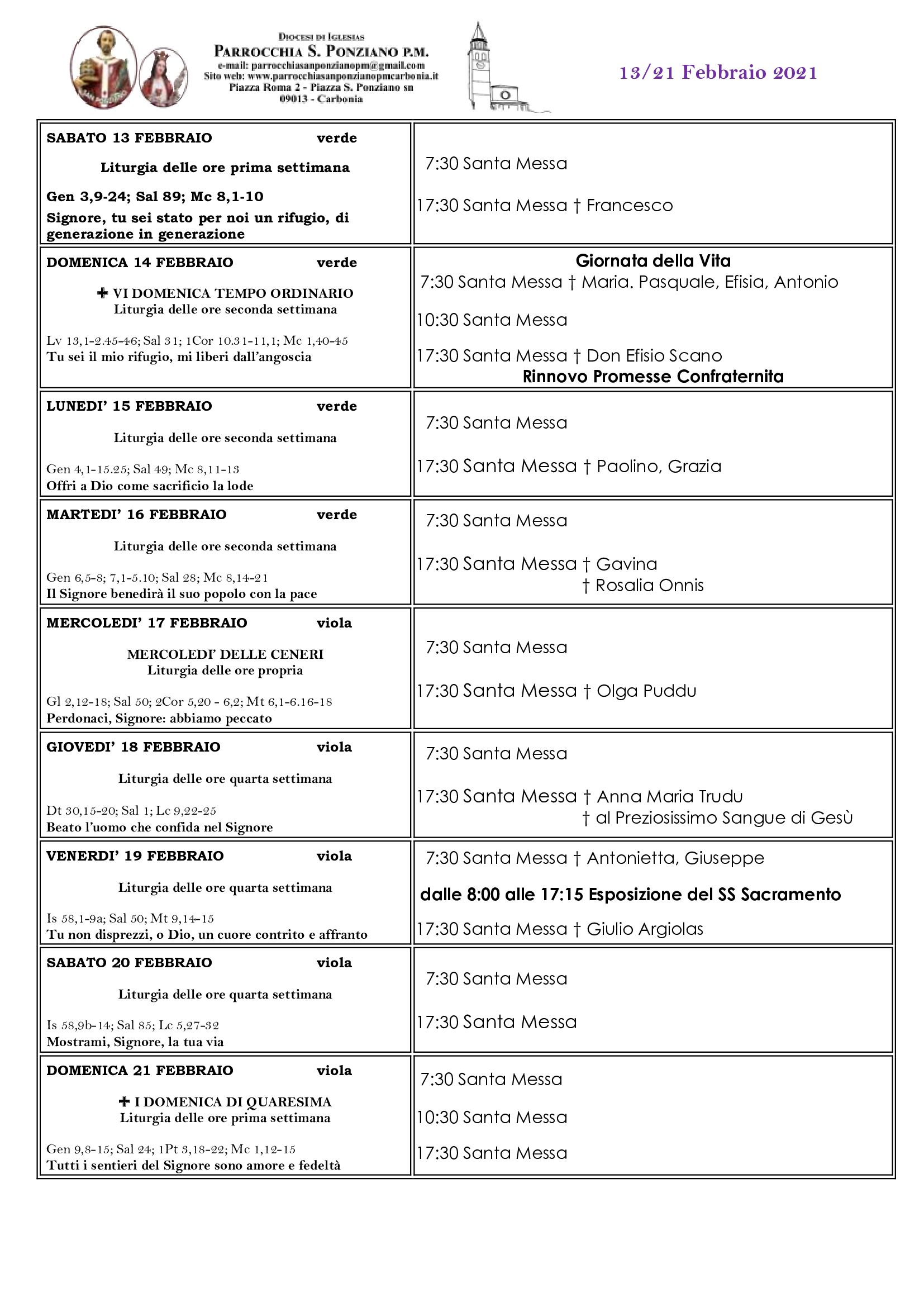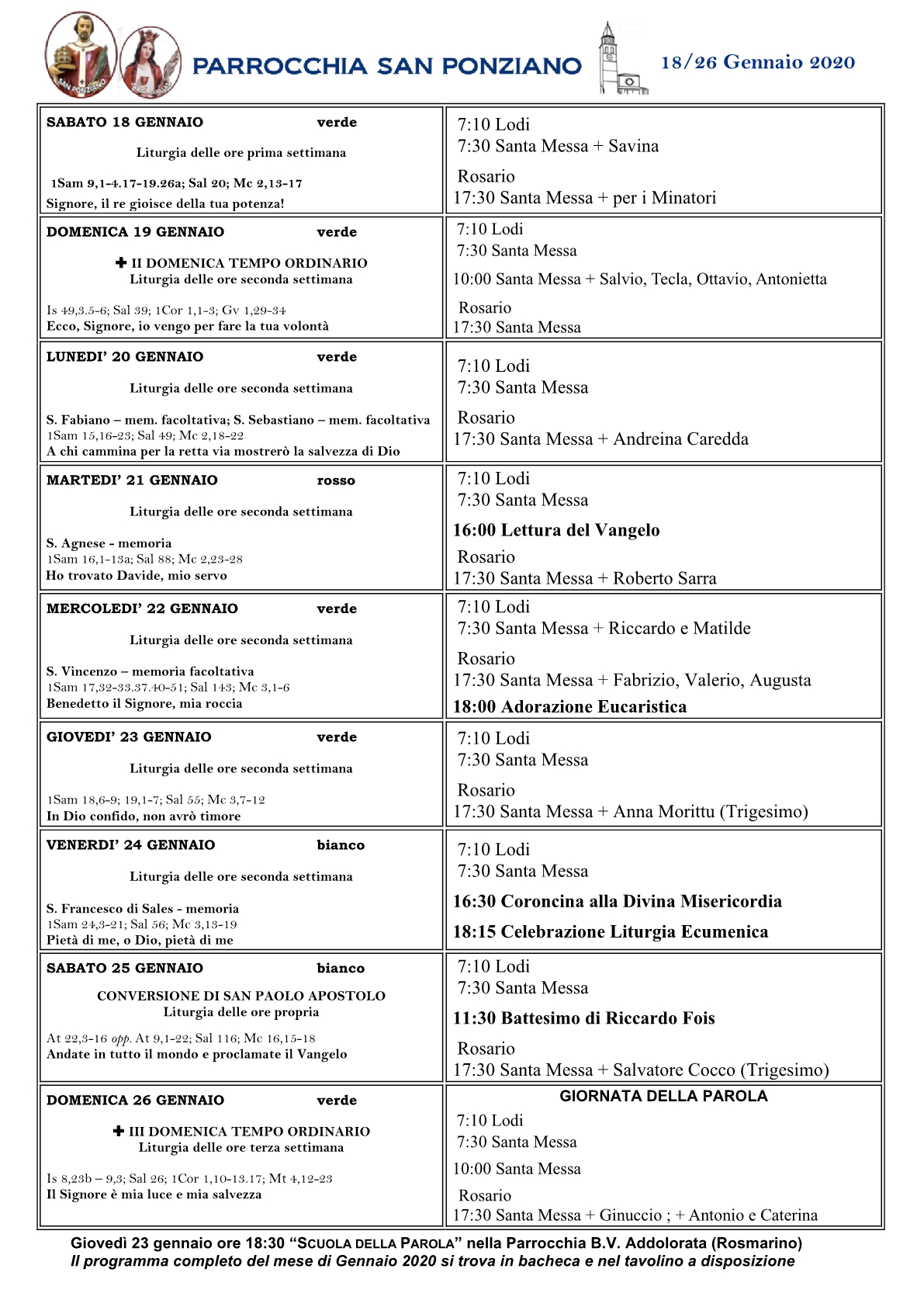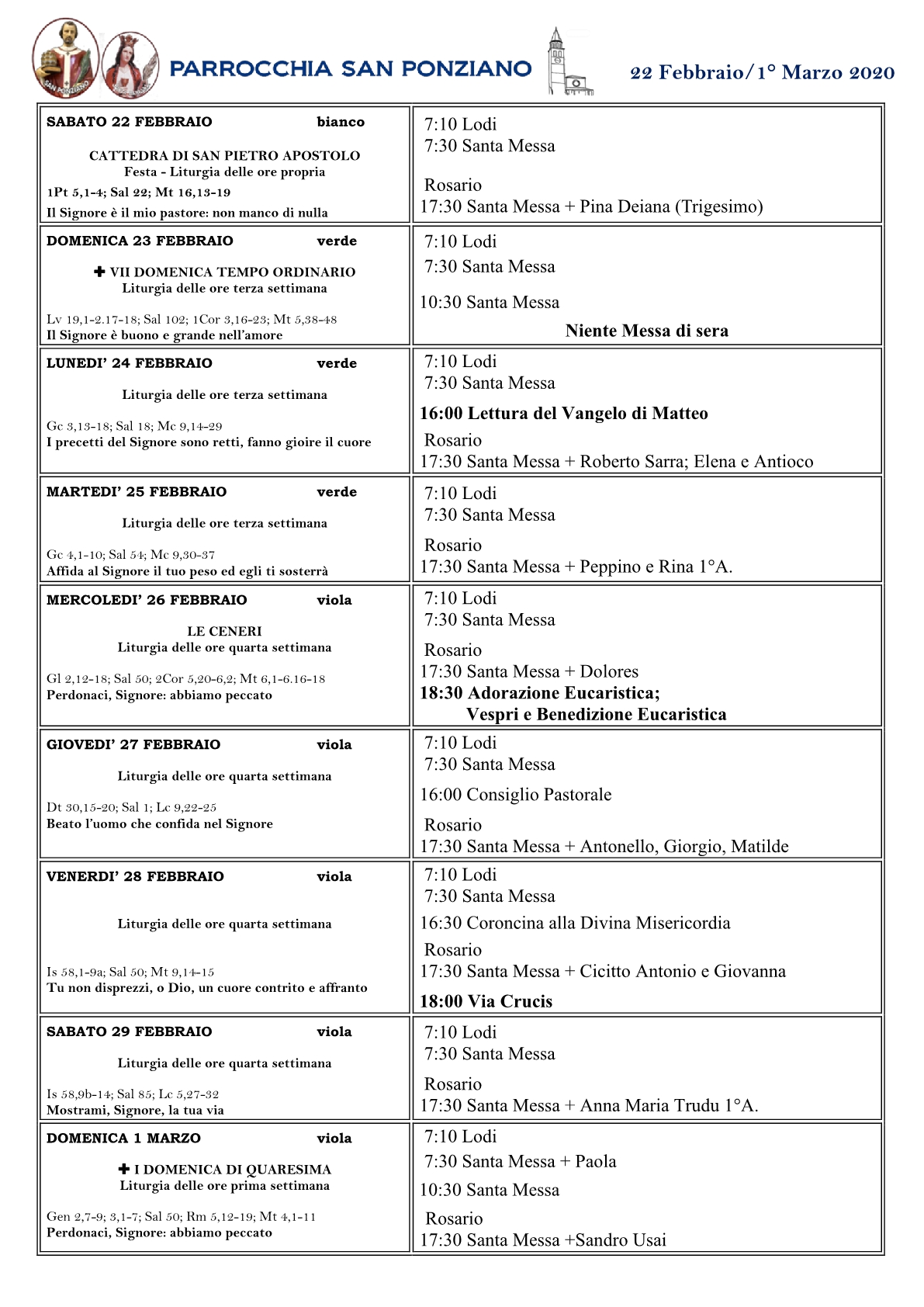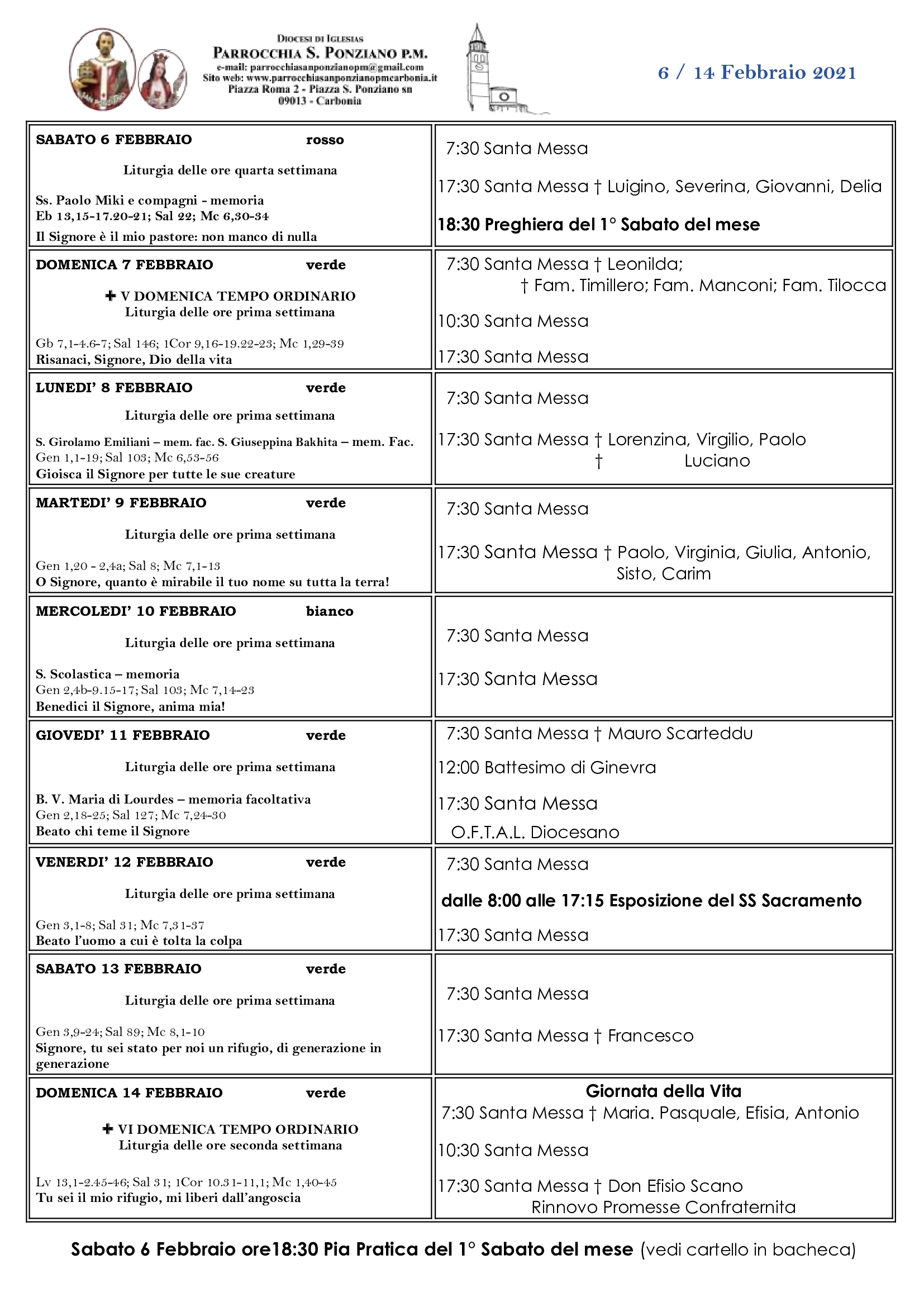 Avvisi della settimana (vedi programma incontri del mese Febbraio 2020 in bacheca)